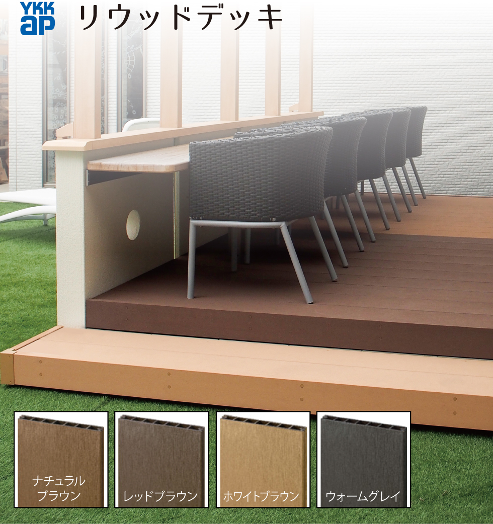 西神戸店で展示している〈リウッドデッキ〉は「お手入れが簡単で耐久性に優れた素材を使用しています。天然木特有の温かみを生かしたデッキ空間を作り出します。素材の「リウッド」は木粉とプラスチック(ポリプロピレン)を主原料とした、住む人の健康に配慮したノンホルムアルデヒド商品です。製造過程で接着剤を使わないため、人体に影響をおよぼす有害物質が発生しにくく、リサイクルが可能です。肌触り、香りともにきわめて天然木に近い感触を持ちながら、人や地球環境にやさしい素材です。