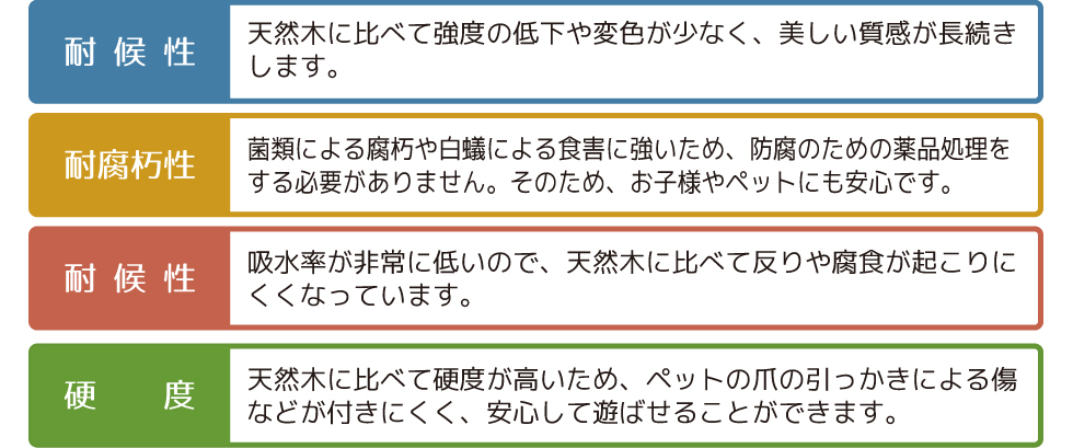 肌触り、香りともにきわめて天然木に近い感触のデッキ